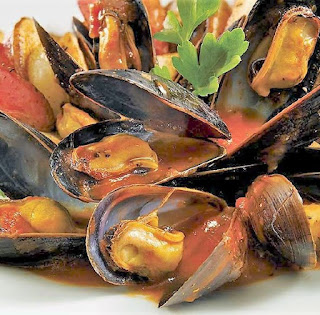 We usually buy mussels in a sac, one will do for a delicious starter, two for a sharing main. Make a tomato-based sauce with 2 tins of chopped tomatoes 175 ml of white wine, 2 cloves of grated garlic and a handful of chopped parsley. Let this simmer on a gentle heat.
